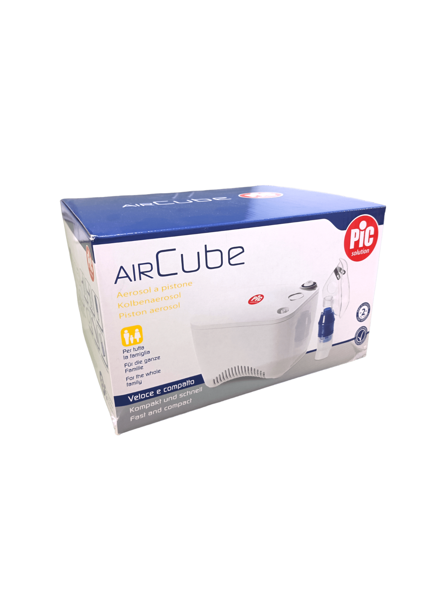 Pic Solution Aerosol Air Cube è un dispositivo per la terapia dell’aerosol a pistone che può essere utilizzato a casa.